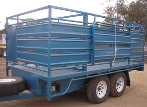 All checkerplate construction, Drop front and rear gates, Hydraulic brakes (1 axle), Rocker springs, Solid duraflex axles, Undercoated and painted hammerfinish, 12 volt LED lights, 5 stud wheels (New Rims & 8 Ply Tyres), Rope rails over guards and back gate, 6″ swivel jockey wheel, Spare wheel (New), Mudflaps, 1100ml High, Stock panel siding, solid front, lift-out back gate (swinging) incorporated slide gate.