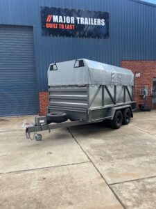 All checker plate construction, Drop front and rear gates, Hydraulic brakes (1 axle), Rocker roller springs, Solid axles, Undercoated & two topcoats painted in a hammer finish, Multi volt LED lights, 5 stud wheels (New Rims & 8 Ply Tyres), Rope rails over guards and back gate, 6″ swivel jockey wheel, Spare wheel (New), Mudflaps, 1830ml high, New style side, semi solid front, lift-out back gate (swinging) incorporated slide gate.